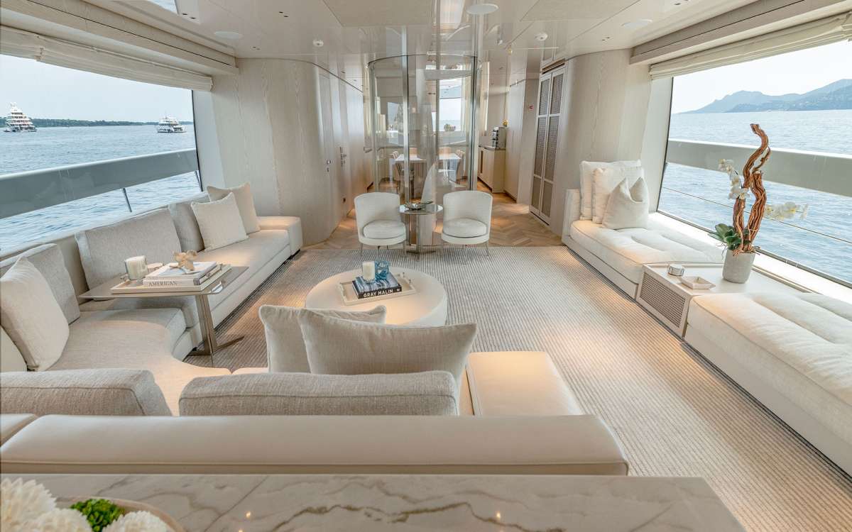 Seamless entry from the aft deck dining into the salon wrapped with seating right up to the large windows for continuous views. Further forward and separated by a central semi-enclosed stairway is the open-plan 'dine in' galley with Hibachi Grill.