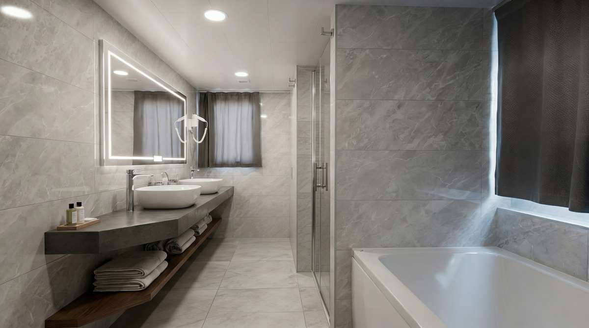 VIP Cabin, 17 m², with double bed (180 x 200 cm). Includes a private bathroom with shower box, bathtub, and home-type toilet, and a 2.7 m² terrace with jacuzzi.